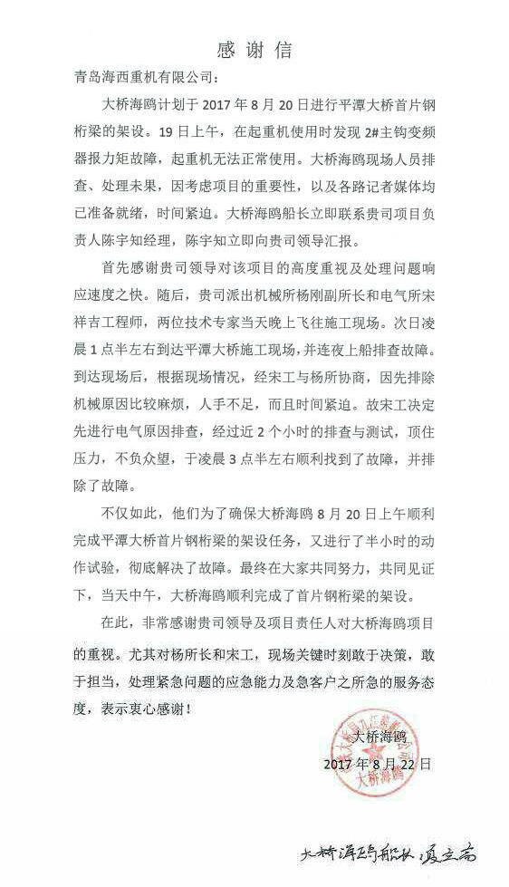 自今年年初設(shè)備交付以來,海西重機(jī)定期安排技術(shù)人員進(jìn)行回訪,協(xié)助業(yè)主方對設(shè)備進(jìn)行檢查和保養(yǎng),及時(shí)處理故障,保證設(shè)備高效運(yùn)作,有力地保障了現(xiàn)場施工的可靠性和穩(wěn)定性,海西重機(jī)工作人員負(fù)責(zé)、用心的工作態(tài)度和完善的售后服務(wù)得到了業(yè)主方的一致好評,業(yè)主特發(fā)來感謝信給予表揚(yáng)。