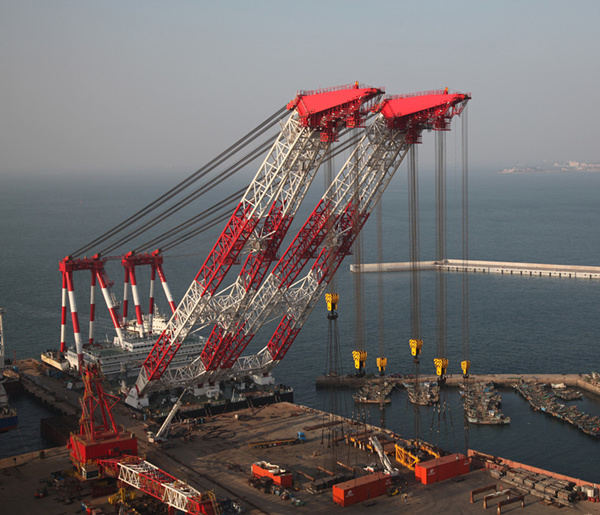 就是這個(gè)正在大顯身手的“大橋海鷗號”起重船,是由青島海西重機(jī)聯(lián)手武船集團(tuán)為中鐵大橋局量身打造的。3600噸浮式起重機(jī)作為起重船核心技術(shù)之一,由青島海西重機(jī)自主研發(fā)、設(shè)計(jì)、制造、安裝和調(diào)試,采用變幅式雙臂架結(jié)構(gòu),其起重重量為3600噸,最高起升高度110米,不僅減小了橋梁吊裝吊具結(jié)構(gòu),而且提高了橋梁吊裝的有效高度,能更好地滿足橋梁吊裝施工的要求,且經(jīng)受住了施工海域風(fēng)大、浪高、水深、流急等惡劣海況的考驗(yàn),成為大橋建設(shè)“左膀右臂”,被用戶親切地稱為“海上建橋神器”。