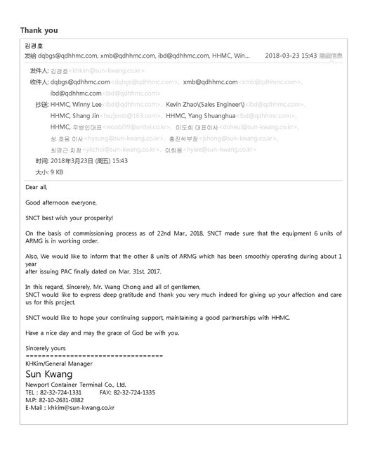 SNCT是韓國仁川新港的碼頭運營商之一,具有較強的實力,此次6臺自動化軌道吊,是繼海西重機2017年向其交付8臺40噸自動化軌道吊之后的第二批軌道吊設(shè)備,至此鮮光新港自動化B堆場14臺軌道吊全部由海西重機提供,用戶自動化堆場的運營能力整體提高20%以上。