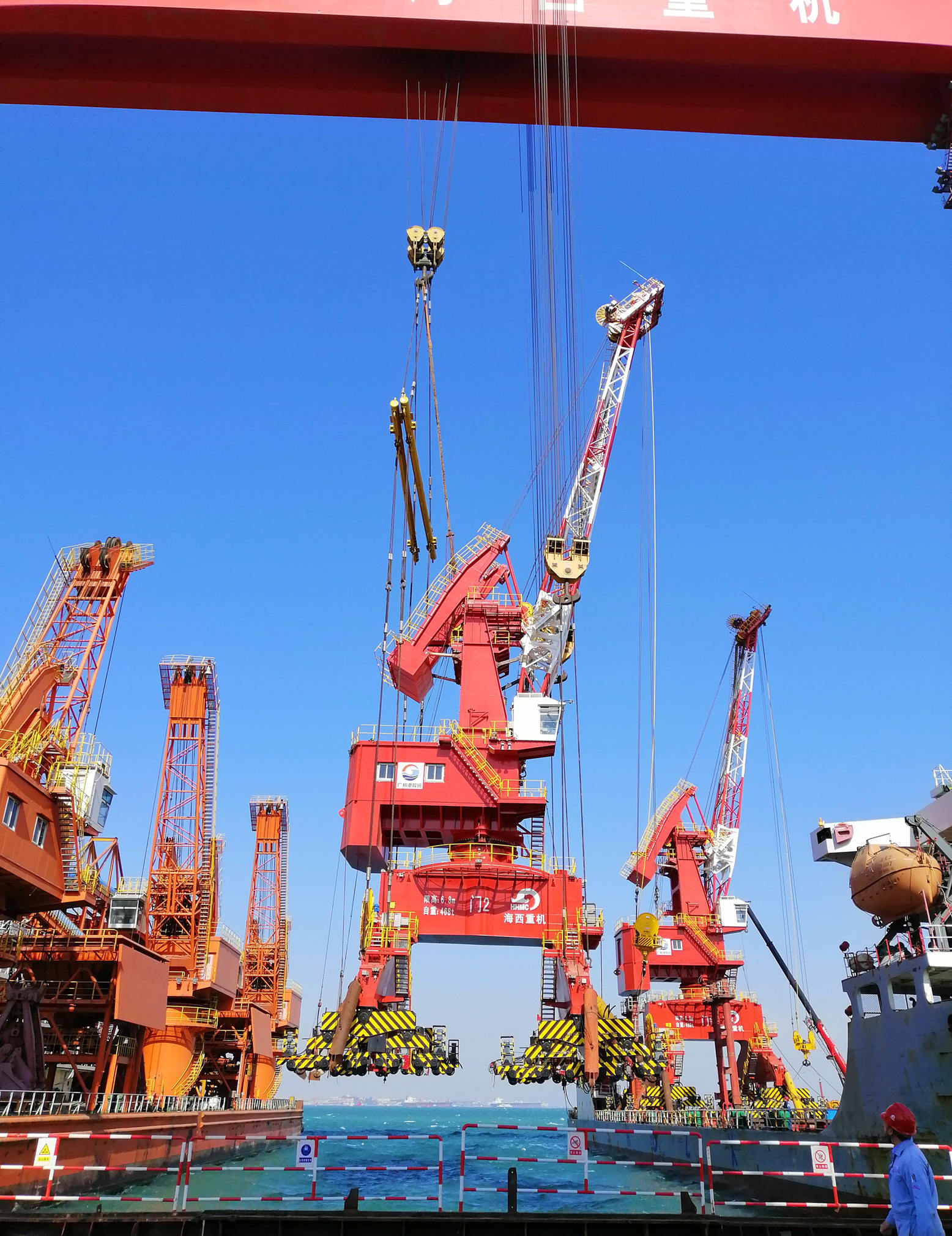 3月15日上午11點,項目組一鼓作氣又完成了第二臺整機吊裝,剩余兩臺門機吊裝準備工作也正在有條不紊的進行。