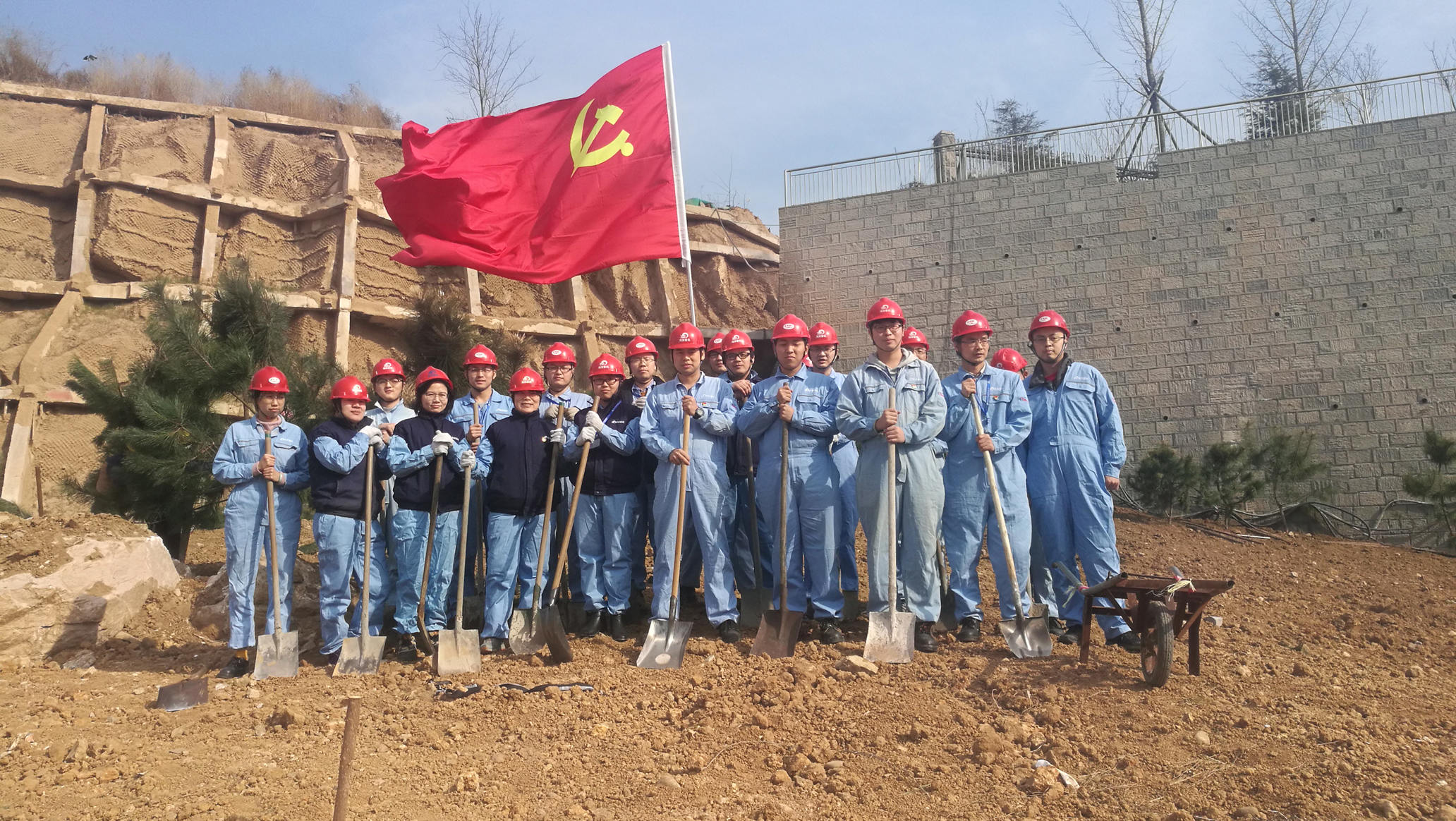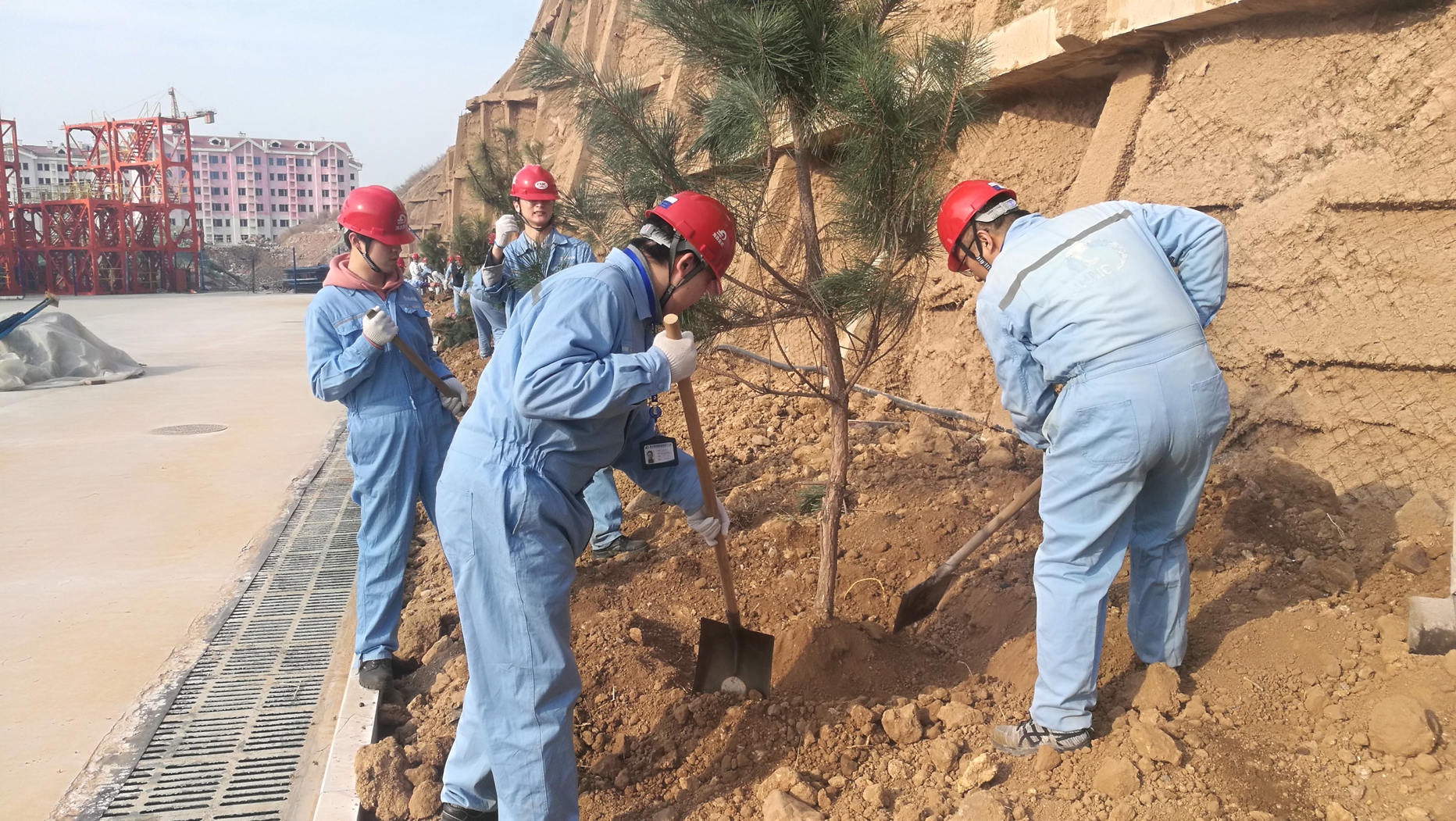 瘠地力挖苗培入,荒坡手植樹皆嘉。三倆人,一棵樹。在廠區(qū)的新建護(hù)坡下,大家熱火朝天的忙著,紛紛揮鍬鏟土,定點挖坑,放苗回填,你扶我植,好不熱鬧。在春天植入希望,我們栽種的不僅是常青樹,更是快樂和責(zé)任。