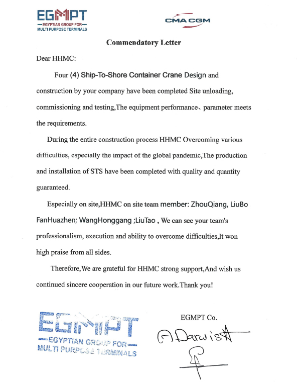 亞歷山大港多用途碼頭為埃及國(guó)家重點(diǎn)項(xiàng)目,埃及國(guó)家領(lǐng)導(dǎo)人員高度關(guān)注該項(xiàng)目進(jìn)展。岸橋到達(dá)用戶碼頭后,項(xiàng)目組嚴(yán)格按照策劃節(jié)點(diǎn)穩(wěn)步推進(jìn)每天工作,確保當(dāng)日事當(dāng)日畢,最終在整個(gè)項(xiàng)目組通力協(xié)作以及用戶的積極配合支持下,岸橋順利完成交付,并按計(jì)劃進(jìn)入保產(chǎn)。期間,埃及總理、交通部部長(zhǎng)對(duì)海西重機(jī)產(chǎn)品及現(xiàn)場(chǎng)項(xiàng)目團(tuán)隊(duì)給予了充分肯定,多家當(dāng)?shù)孛襟w對(duì)此進(jìn)行了專題報(bào)道。用戶特地向我司發(fā)來一封表?yè)P(yáng)信以示感謝。