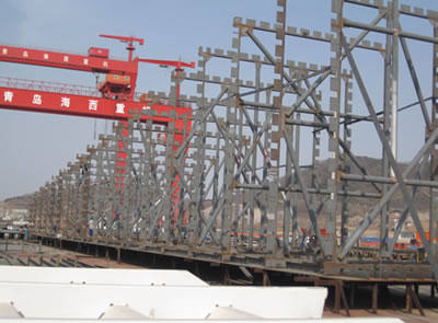 天津新港600T造船龍門吊是青島海西重機(jī)有限責(zé)任公司承接的第一臺大型龍門起重機(jī),合同總額1.05億元,是公司關(guān)鍵項(xiàng)目。公司領(lǐng)導(dǎo)高度重視,專門成立了以公司總經(jīng)理為組長的項(xiàng)目組,在全公司實(shí)施精品戰(zhàn)略,本著“作一臺設(shè)備,占一片市場,交一個朋友”的宗旨,從聯(lián)合設(shè)計到注重制造的每一個細(xì)節(jié),海西重機(jī)都組織了多次討論,全力保證產(chǎn)品質(zhì)量。