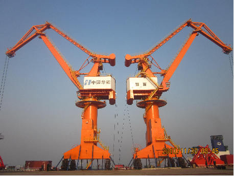 我司為中國華能董家口港制造的2臺(tái)MQ4040門座起重機(jī)順利滾裝上船