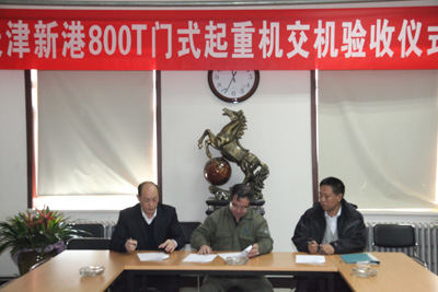 2012年4月7日,天津新港船舶重工第二臺(tái)800噸龍門吊交機(jī)驗(yàn)收儀式在業(yè)主方隆重舉行。