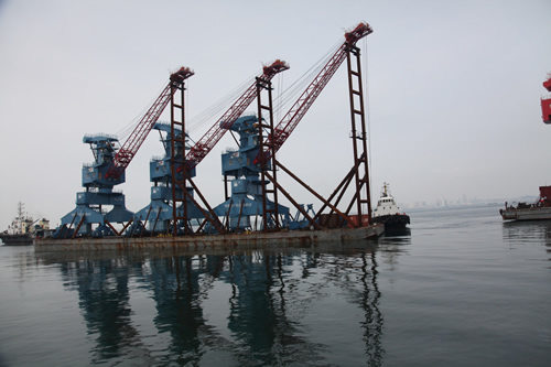 2012年8月17日,3臺單臂架門座式起重機(型號:MQ25t-35m)離開我司碼頭,駛向印尼第二港務(wù)集團公司。