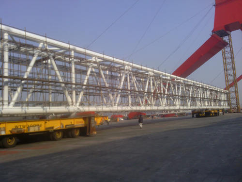 F1是我公司承造的3600T雙臂架變幅浮式起重機項目。臂架中段單片長113米,寬4.5米,高7米。鑒于該構件超長超重,我們采用兩臺平板車協(xié)同作業(yè)的方案。