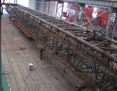 500T全回轉(zhuǎn)固定吊臂架長110米,寬6.5米,高5米,重達(dá)200余噸。自接到生產(chǎn)任務(wù)以來,針對該項目生產(chǎn)任務(wù)緊、制作周期短、難度大等特性,鋼構(gòu)部統(tǒng)籌部署,多管齊下,確保項目進(jìn)展。首先以節(jié)點實現(xiàn)率為重點,細(xì)化施工隊、焊工隊節(jié)點考核,嚴(yán)格執(zhí)行;其次考慮技術(shù)熟練程度和連續(xù)性,所有施工及管理人員均采用3600T浮吊臂架原班人馬,各工種24小時不間斷作業(yè),全力推進(jìn)項目進(jìn)展;第三各負(fù)責(zé)調(diào)度、檢驗人員、工藝人員等各司其職、齊心協(xié)力,監(jiān)管措施到位,工序銜接順暢,確保臂架各分支計劃穩(wěn)步推進(jìn)。在各項有效措施的保障下,在工藝部和品質(zhì)部的全力配合下,該臂架制作歷時不到40天,制作周期較同類型吊臂架縮短了一倍以上,且一次探傷合格率達(dá)98.5%,結(jié)構(gòu)質(zhì)量和外觀成型得到了業(yè)主的一致認(rèn)可和表揚,創(chuàng)造了鋼構(gòu)部制作行架結(jié)構(gòu)件的奇跡!
